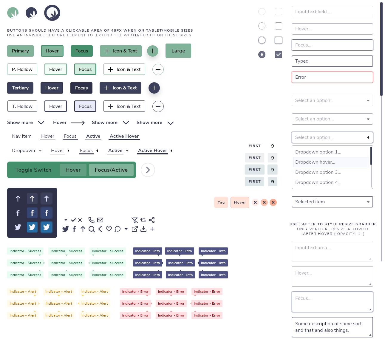 Components were designed with an atomic design structure. Atoms would be present in Molecules, and so on. Using my knowledge of CSS and SCSS I was able to show different states for each, and even add comments that would help in development where necessary.