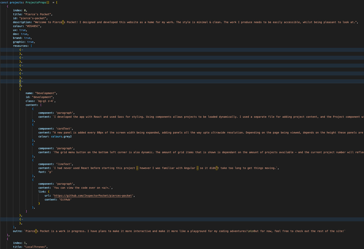 I developed the app with React and Typescript, using Sass for styling. Using components allows projects to be loaded dynamically. I used a separate file for adding project content, and the Project component will loop through the project array to dynamically generate content on the fly.